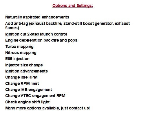 Turbos, superchargers, bolt-ons, conversions, mini-me, nitrous, VTEC swaps, LS VTEC, B20 VTEC, E85 fuel, larger injectors, highly modified engines in need of a custom tune. We tune engines upwards of +800whp, but also stock-like engines.